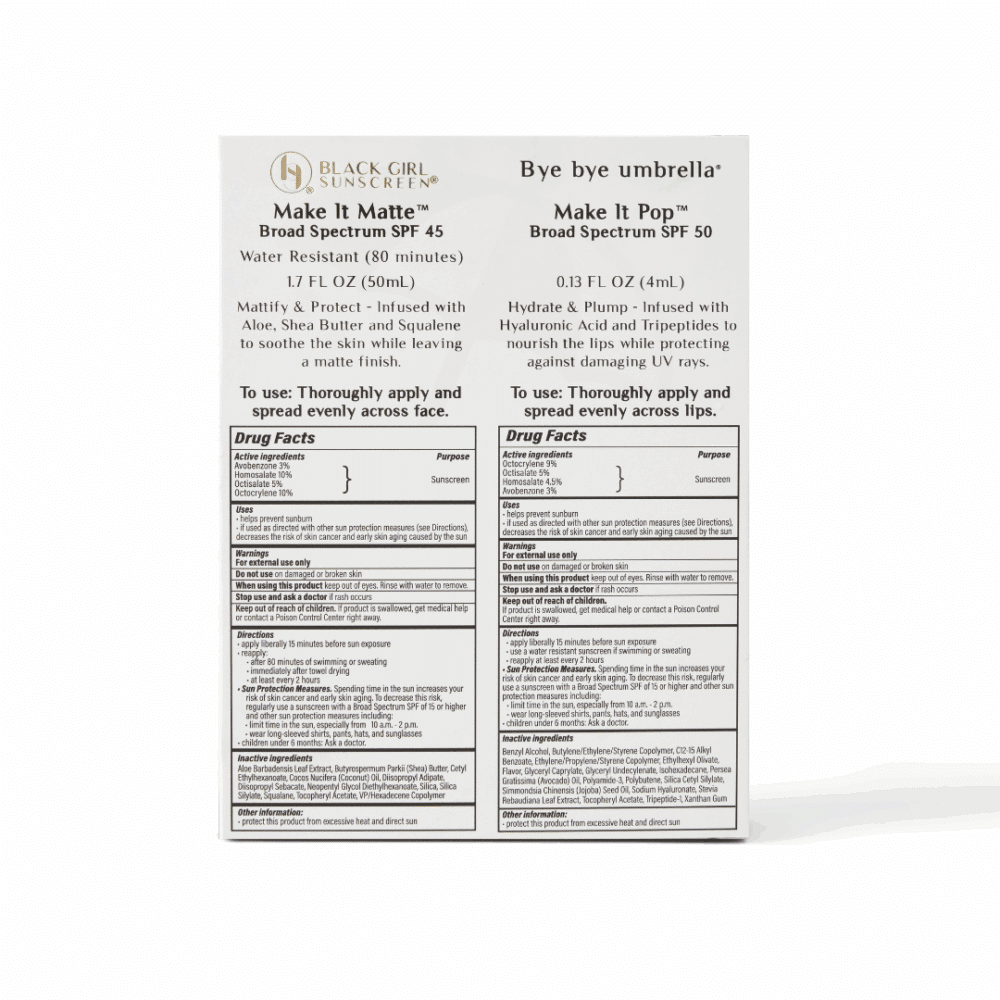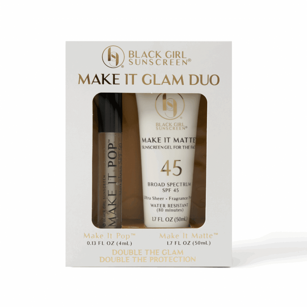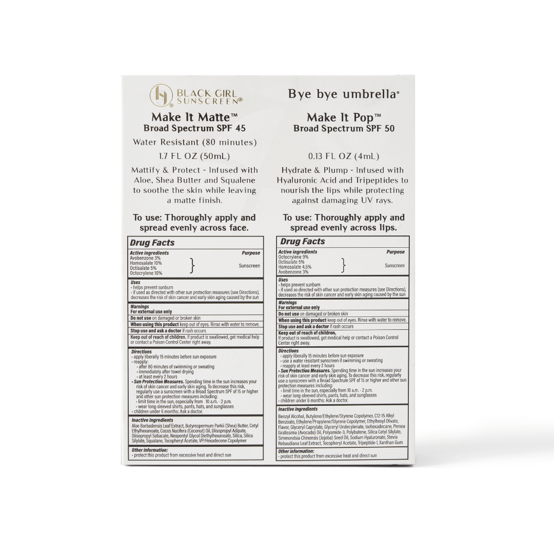 Make It Glam Duo is a limited edition bundle with double the protection. Stay fabulous with Make It Matte™, a broad spectrum SPF 45 mattifying face gel perfect for wearing under makeup. While Make It Pop™ Sungloss™ protects the lips with broad spectrum SPF 50.